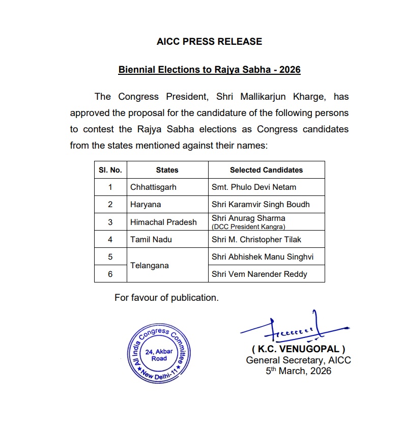 कांग्रेस की घोषणा के अनुसार तेलंगाना से वरिष्ठ नेता और सुप्रीम कोर्ट के जाने-माने वकील अभिषेक मनु सिंघवी को उम्मीदवार बनाया गया है। उनके साथ वेम नरेंद्र रेड्डी को भी तेलंगाना से टिकट दिया गया है। वहीं छत्तीसगढ़ से कांग्रेस ने एक बार फिर आदिवासी नेता फूलो देवी नेताम को राज्यसभा भेजने का फैसला किया है।