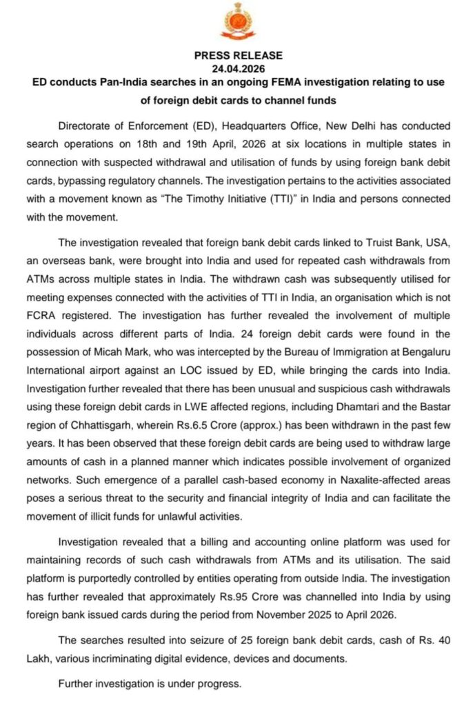 जांच में यह भी खुलासा हुआ है कि विदेशी बैंक डेबिट कार्ड का इस्तेमाल कर भारत में बड़ी मात्रा में कैश निकाला जा रहा था। इस तरीके से फंड को ट्रेस करना मुश्किल बनाया जा रहा था।