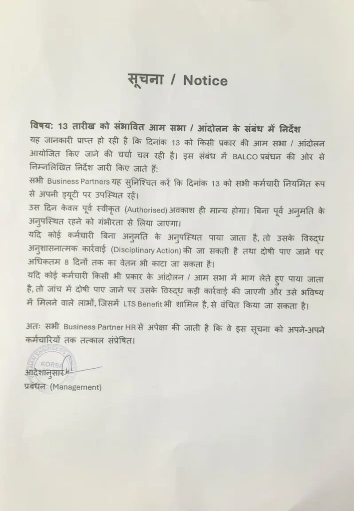दरअसल BALCO प्रबंधन ने प्रस्तावित आम सभा और आंदोलन को लेकर पहले ही एक सख्त नोटिस जारी किया था। नोटिस में कर्मचारियों को निर्देश दिया गया था कि 13 तारीख को सभी कर्मचारी नियमित रूप से अपनी ड्यूटी पर उपस्थित रहें।